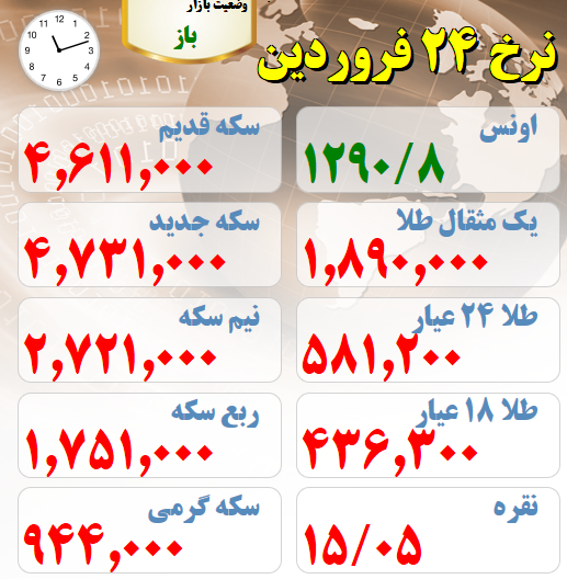 قیمت های بازار طلا و سکه امروز بیست و چهارم فروردین ماه