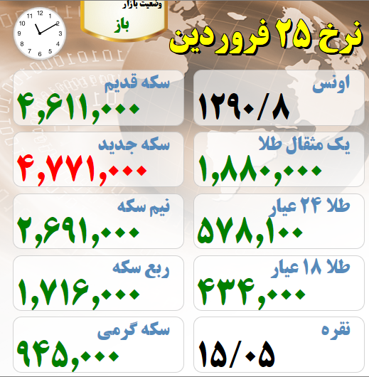 قیمت های بازار طلا و سکه امروز بیست و پنجم فروردین ماه
