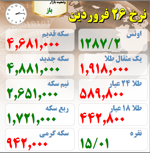 قیمت های بازار طلا و سکه نیمروز بیست و ششم فروردین ماه :