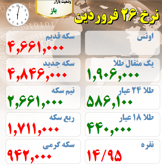آخرین قیمت های بازار طلا و سکه بیست و ششم فروردین ماه :