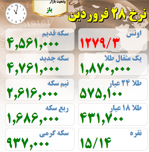 قیمت های بازار طلا و سکه امروز بیست وهشتم فروردین ماه قیمت طلا و سکه در بازار تهران تاریخ: ۲۸/فروردين/۹۸ ساعت ۱۱:۰۵ | اقتصاد ایران شناسه خبر: ۵۲۷۳۶ منبع: سایت طلا خبر را برای من بخوان قیمت های بازار طلا و سکه امروزبیست و هشتم فروردین ماه : (لحظه تنظیم خبر) برچسب ها : قیمت مثقال طلا قیمت طلا قیمت سکه امامی