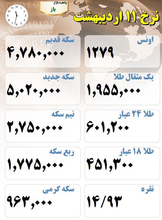 قیمت طلا و سکه 11 اردیبهشت صبح قیمت طلا و سکه / هر گرم طلا 451.000 تومان تاریخ: ۱۱/ارديبهشت/۹۸ ساعت ۱۱:۴۰ | اقتصاد ایران شناسه خبر: ۵۲۸۵۲ خبر را برای من بخوان قیمت ها ساعت 11:30 برچسب ها : قیمت طلا قیمت سکه