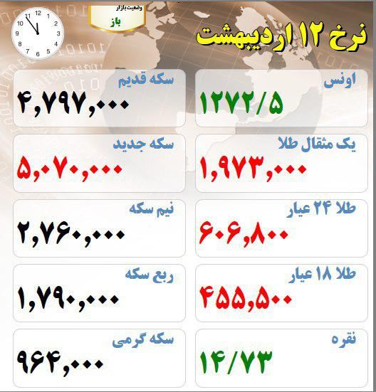 قیمت طلا و سکه مورخ 12 اردیبهشت