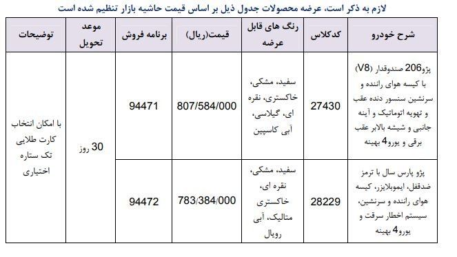 بر اساس اعلام این شرکت، امروز از ساعت ۱۰ صبح پژو ۲۰۶ با قیمت ۸۰ میلیون و ۷۵۸ هزار و ۴۰۰ تومان در قالب طرح فروش فوری عرضه میشود. همچنین پژو پارس سال نیز با مشخصات مندرج در جدول با قیمت ۷۸ میلیون و ۳۳۸ هزار و ۴۰۰ تومان فروخته میشود.