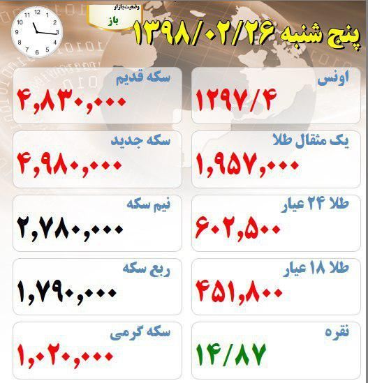 افت قیمت طلا و سکه در معاملات امروز پنجشنبه 26 اردیبهشت ماه