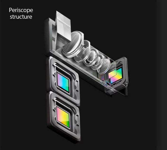 حال بررسی می کنیم چگونه هواهوی می توانید این میزان زوم رو داشته باشد ، یکی از موارد خلاقانه هواوی در بالابردن میزان زوم این گوشی قراردادن لنزهای زوم در بندنه گوشی به صورت عرضی می باشد . و فقط جایی که لنز قرار می گیرید یک آینه 45 درجه ای (پریسکوپ) قرارداده شده و تمامی لنز ها داخل گوشی است و این امر باعث شده تا قطر گوشی ما بسیار کم باشد ولی عملکرد فوق العاده در زوم داشته باشیم