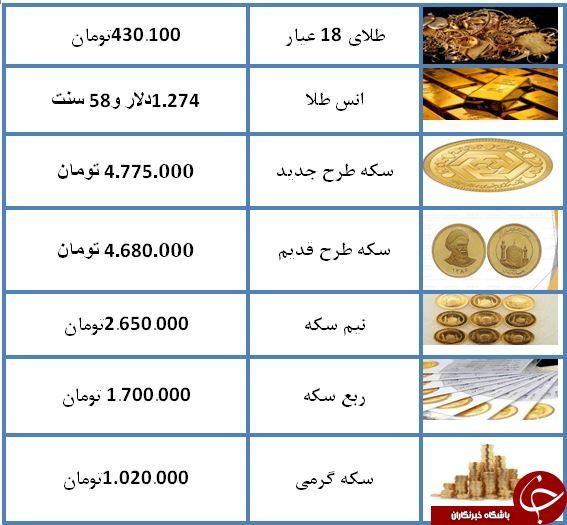 همچنین امروز هر اونس طلا در بازارهای جهانی به ۱.۲۷۴ دلار و ۵۸ سنت رسید. در این بین هر گرم طلای ۱۸ عیار ۴۳۰ هزار و ۱۰۰ تومان رسید.
