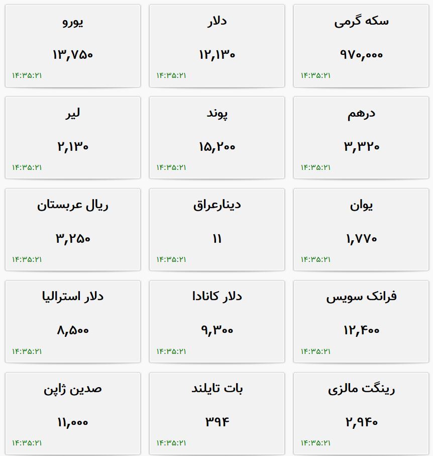 این صرافیها امروز هر یورو را به قیمت ۱۳ هزار و ۷۵۰ تومان میخرند و ۱۳ هزار و ۸۵۰ تومان میفروشند که نسبت به روز گذشته ۵۰ تومان افزایش داشته است.