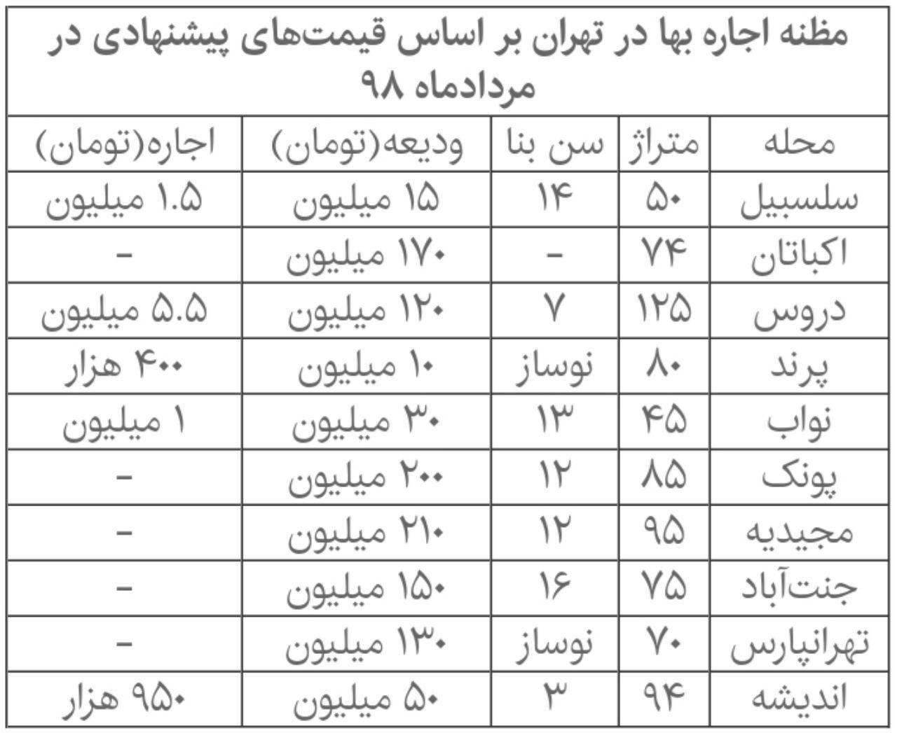 با اینکه بانک مرکزی، میانگین افزایش اجاره بها در شهر تهران طی تیرماه امسال نسبت به تیرماه پارسال را ۲۵ درصد اعلام کرده، بررسیهای میدانی حاکی از آن است که در مناطق دارای سرانههای مناسب و پرتقاضا افزایش، بسیار بیش از این مقدار بوده است. هرچند از اوایل تیرماه قراردادهای اجاره هم راکد شده و مشاوران املاک میگویند که عمده مستاجران قراردادهای خود را تمدید میکنند. مصطفیقلی خسروی رییس اتحادیه مشاوران املاک هم خبر داده که در روزهای اخیر شاهد کاهش قیمتهای پیشنهادی در بازار اجاره هستیم.