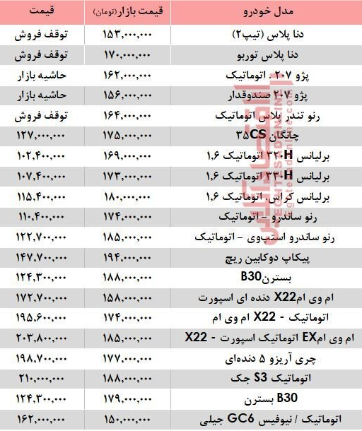 آنچه در زیر میآید قیمت روز خودروهای صفر بازار تهران طی مرداد ماه ۹۸ است که بین ۱۵۰ تا ۲۰۰ میلیون تومان در سطح بازار قیمت خورده که ممکن است تا ۵ درصد در مناطق مختلف تهران دارای نوسان باشد؛