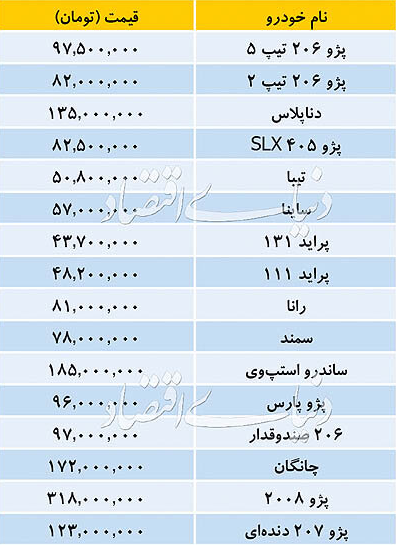 قیمت انواع خودروی داخلی/ ۲۰۶ به ۸۲ میلیون تومان رسید قیمت انواع خودروهای داخلی اعلام شد. تاریخ: ۲۷/مرداد/۹۸ ساعت ۱۰:۳۱ | خودرو شناسه خبر: ۵۷۴۵۸ منبع: خبر آنلاین خبر را برای من بخوان این جدول در بردارنده قیمت برخی خودروهای پرفروش در بازار است. برچسب ها : قیمت خودرو