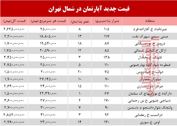 آنچه در زیر میآید جدول قیمت معاملات انجام شده واحدهای مسکونی در مناطق شمالی تهران طی مرداد ماه ۹۸ است.