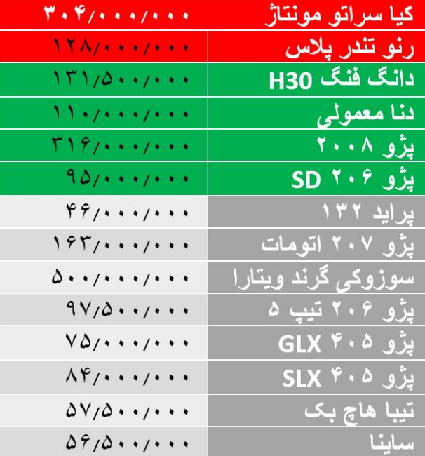 خودروها امروز کاهش چند میلیون تومانی قیمت را از هفته گذشته تجربه کرده اند به طوری که قیمت خودرو پژو ۲۰۶ SD دو میلیون تومان، قیمت خودرو پژو ۲۰۰۸ نزدیک به ۴ میلیون تومان، قیمت خودرو دنا معمولی ۵ میلیون تومان و خودرو دانگ فنگ H۳۰ نزدیک به یک میلیون تومان کاهش داشته است.