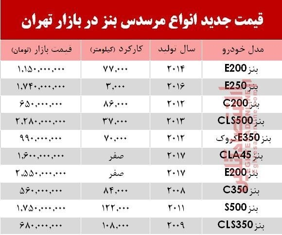 قیمت خودرو مرسدس بنز در بازار +جدول قیمت روز انواع مرسدس بنز صفر و کارکرده در بازار تهران طی مرداد ماه ۹۸ منتشر شد. تاریخ: ۴/شهريور/۹۸ ساعت ۰۸:۴۰ | خودرو شناسه خبر: ۵۷۷۷۴ منبع: خبر آنلاین خبر را برای من بخوان برچسب ها : قیمت مرسدس بنز