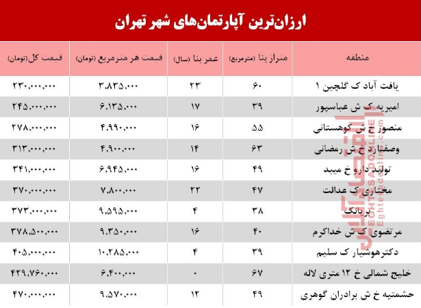 آنچه در زیر می‌آید جدول معاملات انجام شده آپارتمان‌های ارزان‌قیمت فروخته شده در شهر تهران که در مرداد ماه سال ۹۸ معامله شده است.
