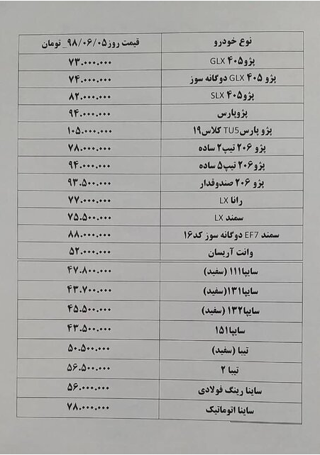 همچنین هر دستگاه پژو پارس ۹۴ میلیون تومان در بازار عرضه شد حالا آنکه دو هفته پیش قیمت آن دو میلیون گران تر بود. قیمت هر پژو ۲۰۶ تیپ پنج ۹۴ میلیون تومان اعلام شده است که حاکی از کاهش یک میلیون تومانی این محصول در ۱۴ روز گذشته است. ضمنا هر خودرو سمند LX ۷۵ میلیون و ۵۰۰ هزار تومان معامله شد.