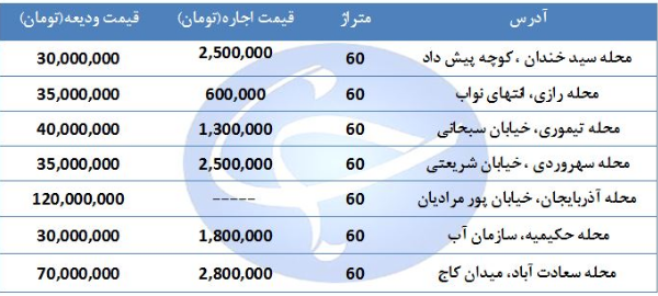 لیست آپارتمانهای مسکونی اجارهای در ۶۰ متری در مناطق مختلف تهران به شرح زیر است. توجه کنید که قیمتها بر حسب مترمربع به تومان بوده و تقریبی است، چراکه قیمت مسکن در تهران با توجه به نوع ساختمان، امکانات، خیابان و یا نظر مالک تغییر میکند.