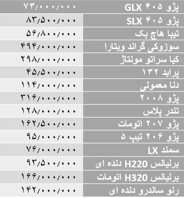 آخرین قیمت خودروها در بازار به شرح زیر است: