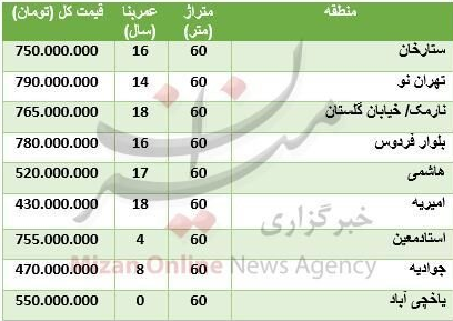 برای خرید واحدهای ۶۰ متری در تهران باتوجه به سال ساخت و موقعیت دسترسی باید هزینه‌های متفاوتی پرداخت که در جدول زیر به برخی ازآن‌ها اشاره شده است.