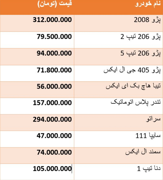برررسی ها نشان می دهد امروز قیمت پژو ۲۰۰۸ نسبت به روز گذشته ۳ میلیون تومان کاهش پیدا کرده است اما قیمت برخی خودروها نسبت به روز گذشته تغییری نکرده است.