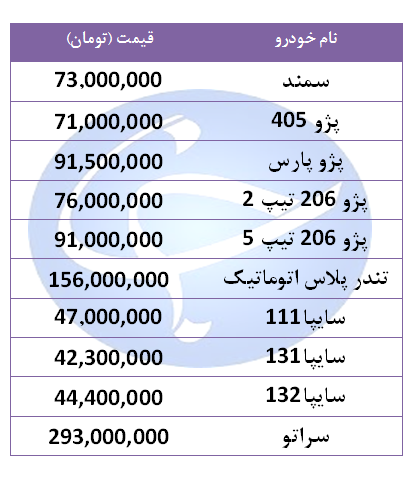 پژو ۴۰۵، ۷۱ میلیون تومان، پژو پارس، ۹۱ میلیون و ۵۰۰ هزار تومان، پژو ۲۰۶ تیپ ۲ (ساده)، ۷۶ میلیون تومان، پژو ۲۰۶ تیپ ۵ (ساده)، ۹۱ میلیون تومان، تندر پلاس اتوماتیک، ۱۵۶ میلیون تومان، سایپا ۱۳۱، ۴۲ میلیون و ۳۰۰ هزار تومان، سایپا ۱۳۲، ۴۴ میلیون و ۴۰۰ هزار تومان و سراتو، ۲۹۳ میلیون تومان بدون تغییر در قیمت در بازار آزاد خودرو خرید و فروش شد.