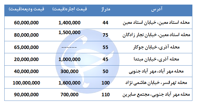 یک دستگاه واحد مسکونی ۶۲ متری واقع در منطقه جوادیه، ۲۰ متری کوچه نصرالهی با مبلغ ۴۰۰ هزار تومان اجاره و ۴۰ میلیون تومان ودیعه معامله میشود.