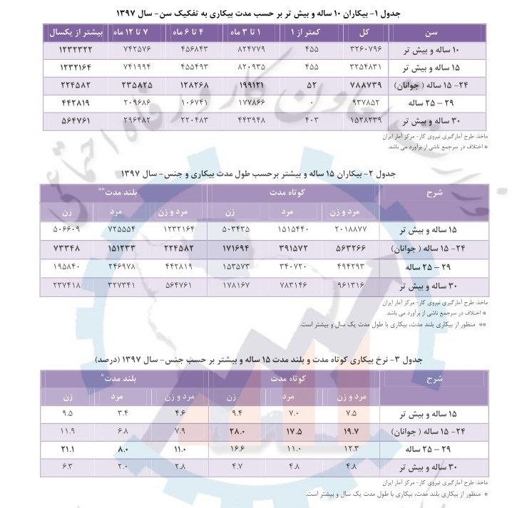 به نظر می رسد بالا بودن این میزان در زنان به دلیل حساسیت آنها برای یافتن نوع کار مورد علاقه و نیز عدم مسئولیت مستقیم آنان در تأمین معاش خانواده نسبت به مردان و یا به لحاظ ترجیح کارفرمایان در بکارگماری مردان نسبت به زنان باشد. سهم بیکاری 15تا29ساله از کل بیکاران کشور در سال 97 تقریباً 52.9 درصد است،سهم بیکاران با طول مدت بیکاری بلندمدت از کل بیکاران کشور در سال 97، تقریباً 37.8 درصد است.