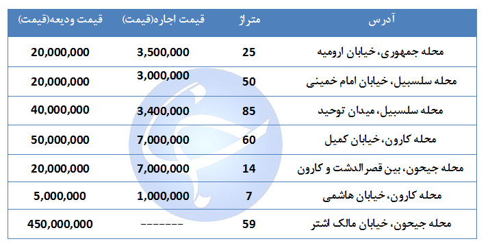 اجاره املاک تجاری و اداری در منطقه ۱۰ تهران /جدول