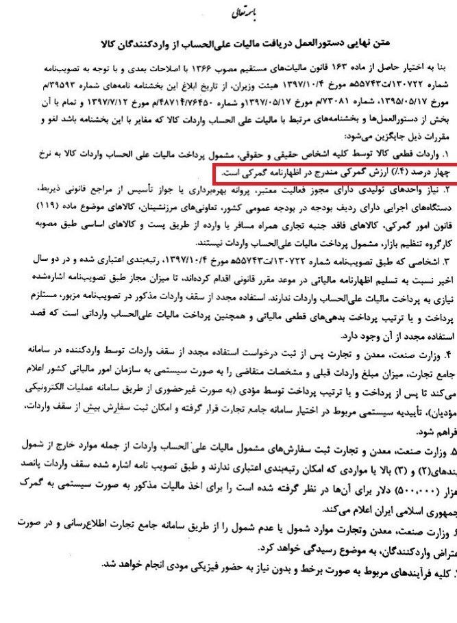 بر این اساس، واردات قطعی کالا توسط کلیه اشخاص حقیقی و حقوقی، مشمول پرداخت مالیات علی الحساب واردات کالا به نرخ چهار درصد ارزش گمرکی مندرج در اظهارنامه خواهد بود.