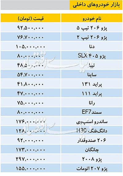 آخرین قیمت خودروهای داخلی/ تیپ ۵ به ۹۲.۵ میلیون تومان رسید قیمت برخی خودروهای پرفروش در بازار اعلام شد. تاریخ: ۲۷/شهريور/۹۸ ساعت ۰۹:۴۶ | خودرو شناسه خبر: ۵۸۹۲۳ منبع: خبرانلاین خبر را برای من بخوان جدول زیر در بردارنده قیمت انواع خودروهای داخلی پرفروش در بازار است. برچسب ها : خودرو قیمت