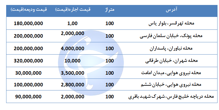 لیست آپارتمان های مسکونی اجارهای ۱۰۰ متری در مناطق مختلف تهران به شرح زیر است. توجه کنید که قیمتها بر حسب مترمربع به تومان بوده و تقریبی است، چراکه قیمت مسکن در تهران با توجه به نوع ساختمان، امکانات، خیابان و یا نظر مالک تغییر میکند.