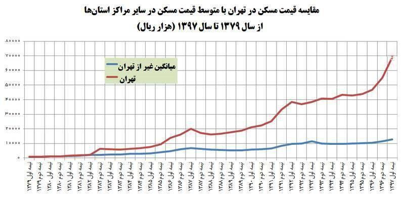 اما اوضاع بازار مسکن در پایتخت کاملا متفاوت از سایر شهرها بوده است. در دو دهه اخیر قیمت مسکن در تهران ۷۵ برابر شده به طوری که از ۹۱ هزار تومان در نیمه اول ۱۳۷۹ به ۶ میلیون و ۸۹۸ هزار تومان در نیمه اول سال ۱۳۹۷ رسید.