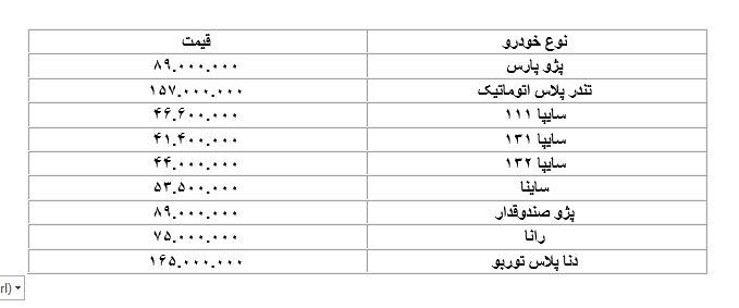 جدول زیر نشان دهنده نرخ برخی خودروهای پرفروش در بازار تهران است.