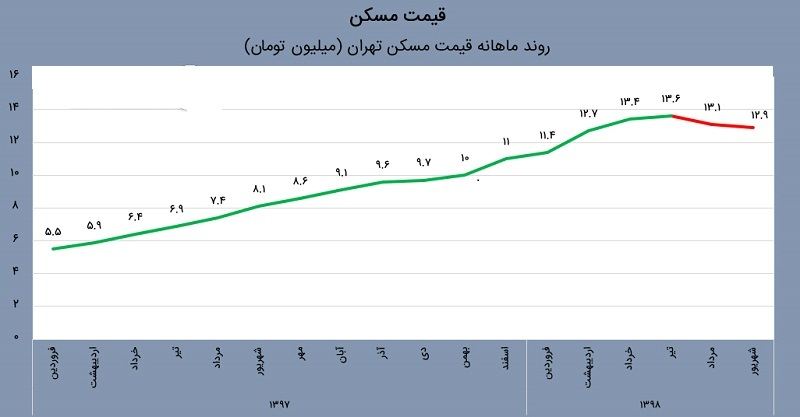 شهریورماه ۱۳۹۸ میانگین قیمت مسکن شهر تهران به ۱۲ میلیون و ۹۶۹ هزار تومان در هر متر مربع رسید که ۱.۷ درصد نسبت به ماه قبل کاهش نشان می دهد؛ مردادماه نیز قیمتها ۳.۱ درصد افت کرده بود.