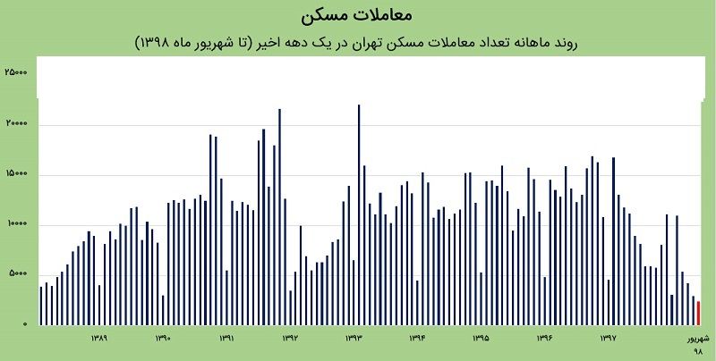 تعداد معاملات نیز افت محسوسی پیدا کرده است. در شهریورماه ۱۳۹۸ بالغ بر ۲۸۵۵ قرارداد خرید و فروش مسکن در شهر تهران به امضا رسیده که از کاهش ۱۵ و ۷۳ درصد به ترتیب نسبت به ماه قبل و ماه مشابه سال قبل حکایت دارد.
