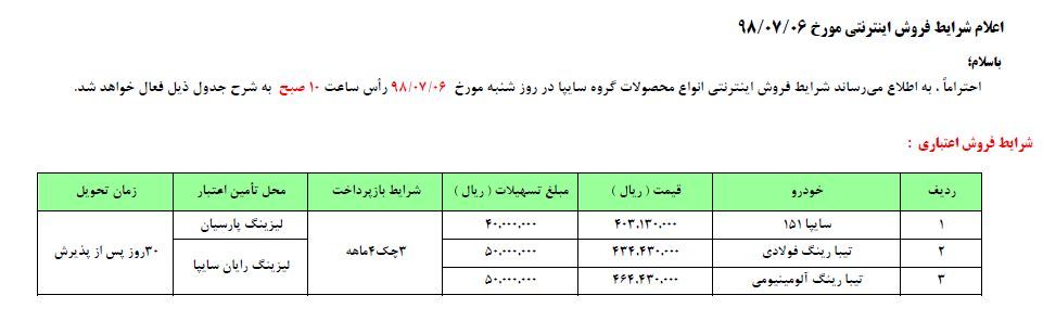 گروه خودروسازی سایپا شرایط فروش نقدی و نقد و اقساطی تعدای از خودروهای خود در روزهای ۶ و ۷ مهر را اعلام کرد.