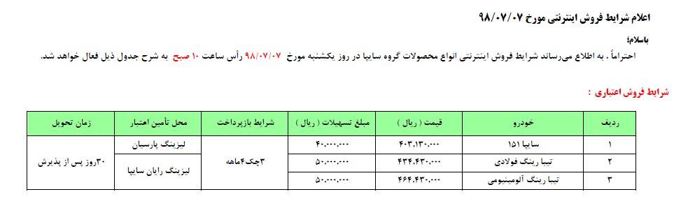 به گزارش سایت طلا، شرکت سایپا اعلام کرد: به اطلاع متقاضیان محترم میرساند، شرایط فروش اقساطی محصولات شرکت سایپا روز 6 و 7 مهر ماه ساعت ۱۰ صبح اجرا می شود.