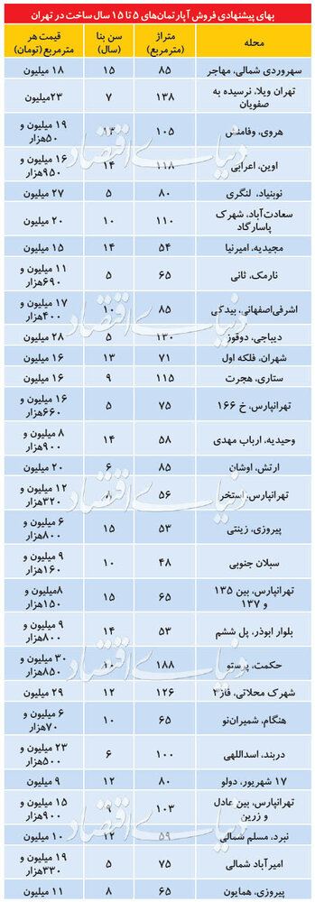 قیمت آپارتمانهای ۵ تا ۱۵سال ساخت در مناطق مختلف تهران/ جدول