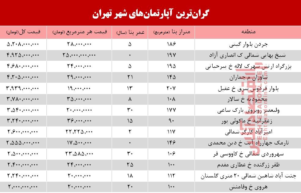 آنچه در زیر می‌آید جدول معاملات انجام شده آپارتمان‌های گران قیمت فروخته شده در شهر تهران که در مهر ماه سال۹۸ معامله شده است.