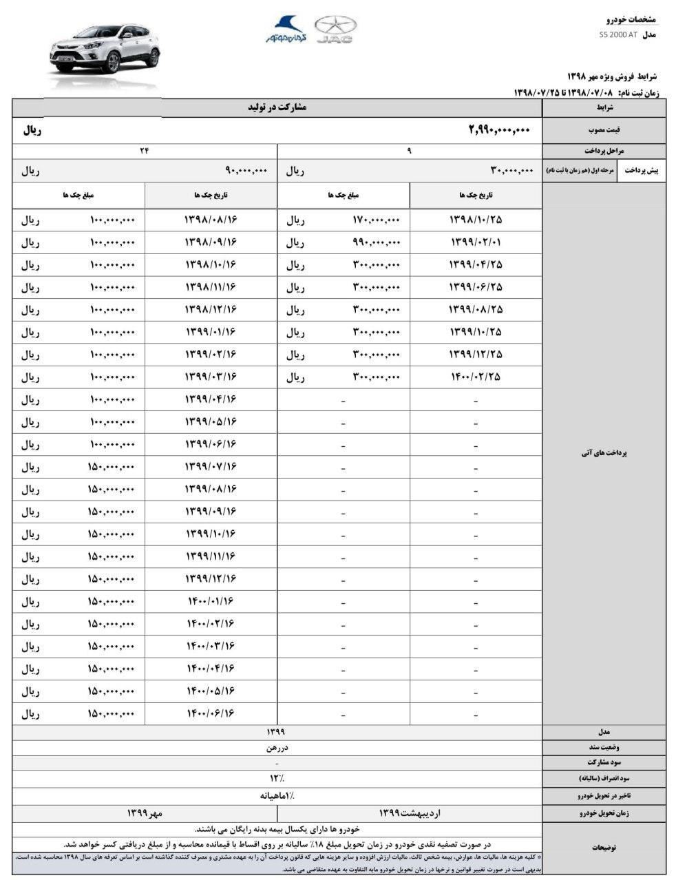 شرایط جدید فروش اعتباری جک اس5 ویژه مهرماه 98 اعلام شد. در این طرح فروش قیمت این خودرو 299 میلیون تومان تعیین شده است که مشتریان می توانند آن را به صورت اقساط خریدارای کنند.