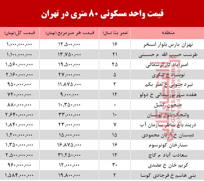 مظنه واحدهای ۸۰ متری در تهران؟ +جدول