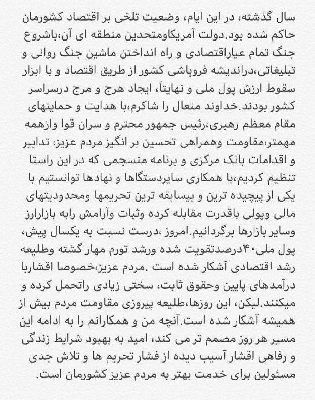 رئیس کل بانک مرکزی طی یادداشتی در صفحه شخصی خود در فضای مجازی نوشت:" سال گذشته در این ایام وضعیت بدی بر اقتصاد کشورمان حاکم شده بود. دولت آمریکا و متحدین منطقه ای آن با شروع جنگ تمام عیار اقتصادی و راه انداختن ماشین جنگ روانی و تبلیغاتی در اندیشه فروپاشی کشور از طریق اقتصاد و با ابزار سقوط ارزش پول ملی و نهایتا ایجاد هرج و مرج در سراسر کشور بودند. خداوند متعال را شاکرم باهدایت و حمایت های مقام معظم رهبری، رئیس جمهور محترم و سران قوا و از همه مهمتر، مقاومت و همراهی تحسین برانگیز مردم عزیز، تدابیر و اقدامات بانک مرکزی و برنامه منسجمی که در این راستا تنظیم کردیم، با همکاری سایر دستگاه ها و نهادها توانستیم با یکی از پیچیده ترین و بی سابقه ترین تحریم ها و محدودیت های مالی و پولی با قدرت مقابله کرده و ثبات و آرامش را به بازار ارز و سایر بازارها برگردانیم. امروز درست نسبت به یکسال پیش، پول ملی 40 درصد تقویت شده و رشد تورم مهار گشته و طلیعه رشد اقتصادی آشکار شده است. مردم عزیز خصوصا اقشار با درآمدهای پایین و حقوق ثابت سختی زیادی را تحمل کرده و می کنند. لیکن این روزها طلیعه پیروزی مقاومت مردم بیش از همیشه آشکار شده است. آنچه من و همکارانم را به ادامه این مسیر هر روز مصمم تر می کند امید به بهبود شرایط زندگی و رفاهی اقشار آسیب دیده از فشار تحریم ها و تلاش جدی مسئولین برای خدمت بهتر به مردم عزیز کشورمان است."