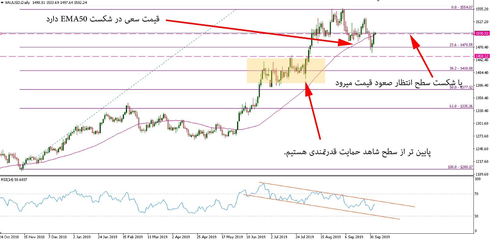 قیمت سعی در شکست قطعی سطح EMA50(میانگین50روز) و قرار گرفتن بالای آن دارد. با توجه به اتفاقات روز گذشته و اخبار اقتصادی آمریکا در خصوص شاخص های اقتصادی این کشور و هجوم سرمایه گذاران به سمت دارایی های امن نظیر دلار شاهد افزایش قیمت این فلز زرد قیمتی بودیم.