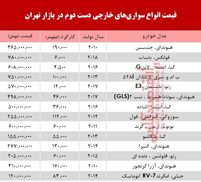 آنچه در زیر میآید قیمت روز انواع خودروهای خارجی دست دوم در سطح بازار تهران طی مهر ۹۸ است؛ لازم به توضیح است؛ سواریهای زیر ممکن است به دلایل مختلف از جمله تصادف و وجود لکه رنگ و یا فروش فوری خودرو از سوی مالک به علت نیاز ضروری به پول نقد، کمتر از قیمتهای رایج در بازار خرید و فروش خودروهای دست دوم عرضه شود