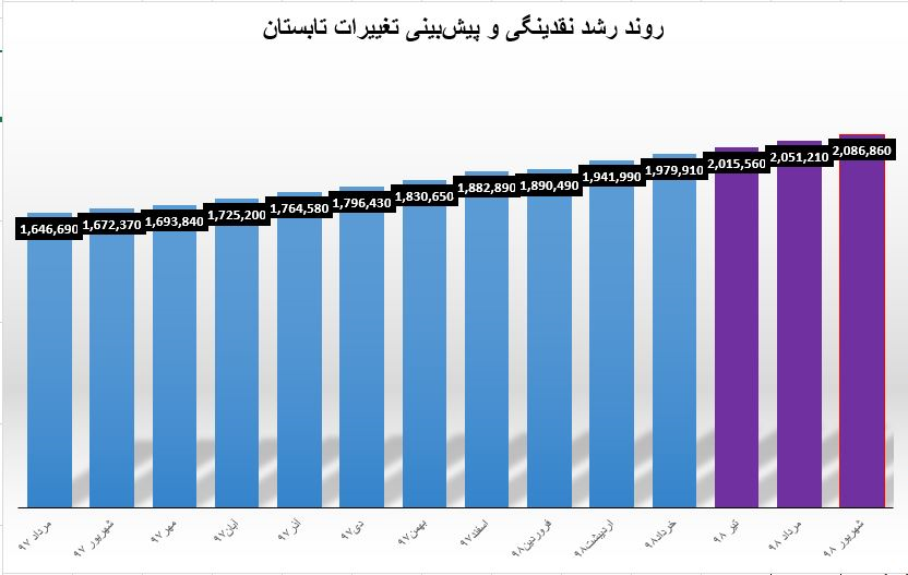 در صورتی که این روند در روزها و ماه های بعد از خرداد ماه و تا پایان شهریور ماه امسال ادامه یافته باشد، حجم نقدینگی تا پایان تابستان به 2 هزار و 86 هزار و 860 میلیارد تومان رسیده است.