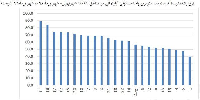 به گزارش سایت طلا به نقل از ایسنا، آمار گویای آن است که مناطق ۱۱، ۱۶، ۱۷، ۱۲، ۱۵ و ۲۰ به ترتیب بیشترین نرخ رشد قیمت مسکن شهر تهران در شهریورماه ۱۳۹۸ را به خود اختصاص دادهاند. میانگین قیمت مسکن در این مناطق ۷.۴ میلیون تومان است که بیشترین نرخ مربوط به منطقه ۱۱ با میانگین متری ۹.۵ میلیون تومان و کمترین قیمت در این میان به منطقه ۲۰ با متوسط ۶.۶ میلیون تومان در هر متر مربع تعلق دارد.