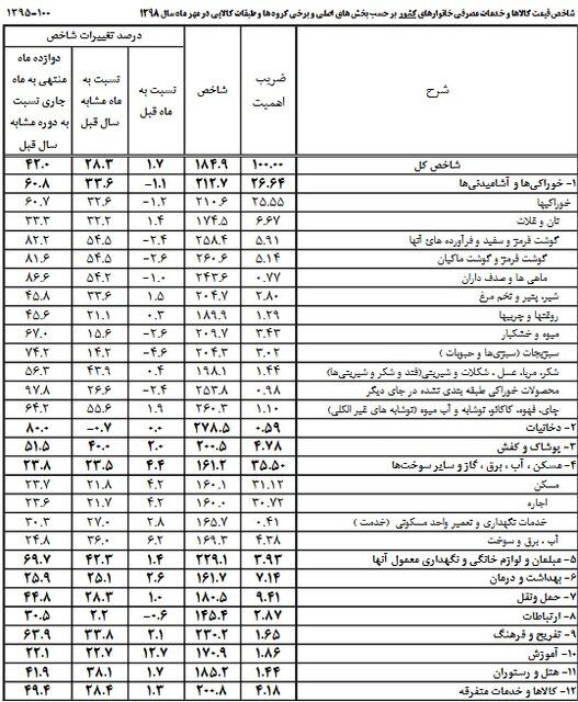 اما در بین کالا و خدمات مصرفی مردم خوراکیها و آشامیدنیها نسبت به مهرماه سال گذشته ۳۳.۶ درصد افزایش قیمت داشته است و در سایر بخشها همچنان گوشت قرمز، ماکیان و ماهیها دارای بیشترین تورم هستند، در حال حاضر برای خرید گوشت قرمز و مجموعه این گروه نسبت به مهرماه سال گذشته، ۵۴ درصد هزینهها افزایش دارد.