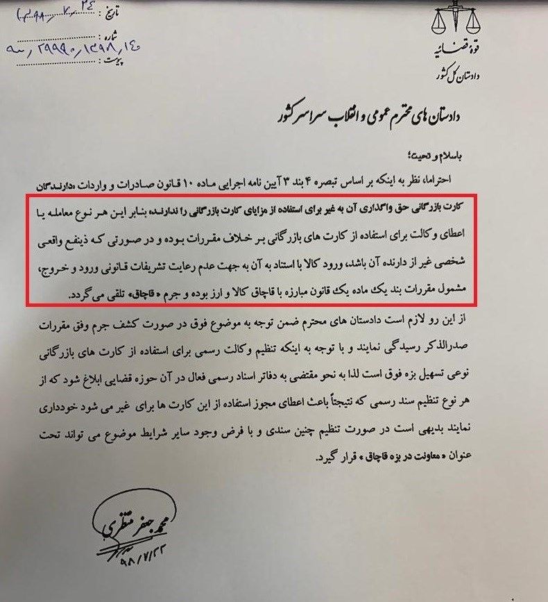 دادستان کل کشور در بخشنامهای تاکید کرد، ورود کالا با کارت بازرگانی افراد دیگر مشمول مقررات بند یک ماده یک قانون مبارزه با قاچاق کالا و ارز بوده وجرم قاچاق تلقی میگردد.