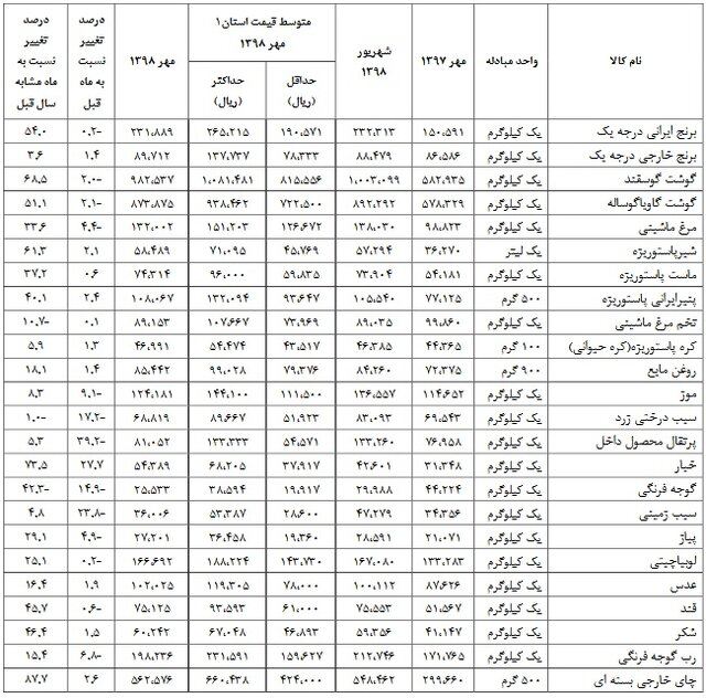 در بین ۲۴ قلم کالای خوراکی برنج ایرانی ۰.۲ درصد کاهش قیمت داشته است. از سوی دیگر گوشت گوسفند و گوشت گاو یا گوساله نیز حدود دو درصد در مهر نسبت به شهریورماه کاهش قیمت دارد ولی همچنان افزایش قیمت آنها نسبت به مهر ماه سال گذشته قابل توجه است؛ به طوریکه در حال حاضر گوشت گوسفند ۶۸.۵ درصد و گوشت گاو یا گوساله ۵۱.۱ درصد در مقایسه با مهر ۱۳۹۷ افزایش قیمت دارد.