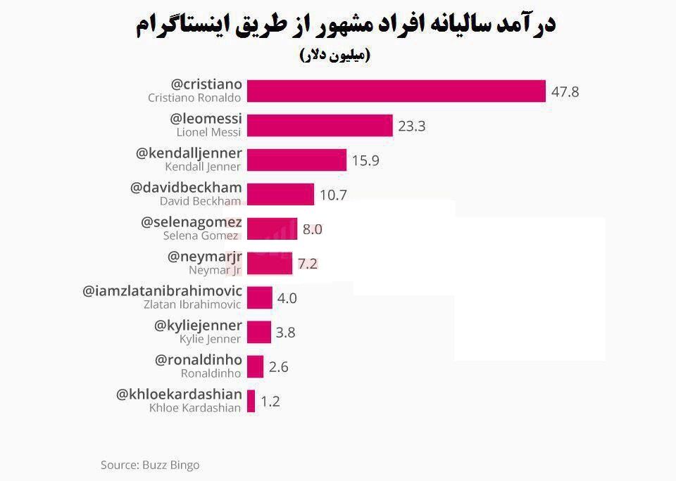 قابل ذکر است که کریستیانو رونالدو، با 187 میلیون دنبالکننده در اینستاگرام، مجموع درآمد سالیانه 47.8 میلیون دلار، و دریافت یک میلیون دلار برای برای هر پست در این شبکه اجتماعی، جایگاه نخست را کسب کرده است.